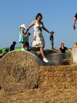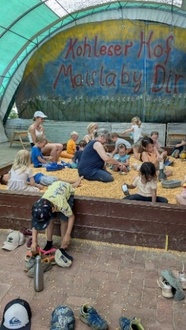 Nach einem stärkenden Frühstück auf der großen Wiese gingen die Kinder auf Entdeckungstour. Sie konnten dabei auf der Strohballenburg hüpfen, in das Maisbad “eintauchen“, mit unzähligen Fahrzeugen ihre Fahrkünste testen, verschiedene Tiere kennenlernen und auf dem Sandberg spielen.