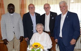 Von links: Pfarrer Dr. Innocent Oyibo, Ortsvorsteher Eugen Heidelmeier, Kreisbeigeordneter Joachim Janshen und Bürgermeister Timo Zentgraf gratulierten Luzia Jacobi zum 103. Geburtstag.
