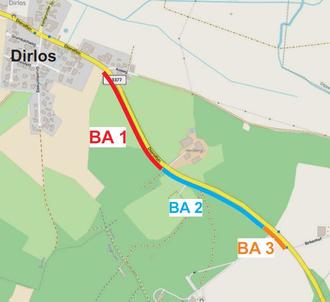 Der erste Bauabschnitt beginnt bei Dirlos im Bereich der Bushaltestelle, Einmündung Auweg und verläuft bis zur Zufahrt der Töpferei. Der zweite Bauabschnitt erstreckt sich von der Töpferei bis zur Zufahrt Loheland. Der dritte Bauabschnitt erfolgt im Bereich der Bushaltestelle bei Loheland, die in der Folge nicht bzw. nur eingeschränkt angefahren werden kann. Die Zufahrt Loheland ist während der ersten beiden Bauabschnitte frei zugänglich, im dritten Bauabschnitt wird eine Ampelschaltung eingerichtet.