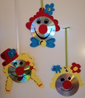 Mit den wasserfesten Stiften malt Ihr auf die CD-Rückseite die Augen und den Mund des Clowns. Die rote Nase schneidet Ihr aus dem Tonpapier aus und klebt sie in die Mitte der CD. Dann schneidet ganz individuell die Haare, einen Hut oder Blumen aus dem bunten Tonpapier aus und klebt es auf die CD. Jetzt noch ein Loch rein, ein Seil dran und schon ist die schöne Fastnachtsdeko fertig.