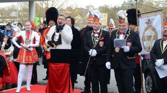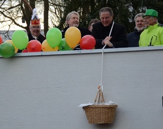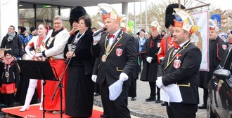 Zahlreiche Karnevalisten hatte der Geselligkeitsvereins Künzell (GVK) eingeladen, um traditionell das Künzeller Rathaus zu erstürmen. Gemeinsam mit den befreundeten Vereinen aus Bachrain, Engelhelms, Dirlos, Rommerz und Hammelburg schlängelte sich ein bunter Lindwurm vom Gemeindezentrum durch die Straßen von Künzell. Am Rathaus wurde die Gruppe vom Ersten Beigeordneten Rainer Kremer empfangen, der von den Mitarbeitern der Verwaltung, Mitgliedern des Gemeindevorstandes und der Gemeindevertretung sowie einigen Künzeller Ortsvorstehern unterstützt wurde. Sie alle hatten sich mit der Gemeindekasse auf der Dachterrasse der Garage des Rathauses verschanzt. Kurz danach gesellte sich Timo Zentgraf in seiner Doppelrolle als Prinz und Bürgermeister zu seinem Stellvertreter.