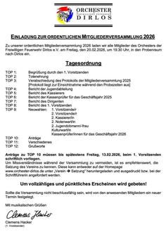 Alles rund um die Versammlung sowie Kontaktdaten haben wir unter www.orchester-dirlos.de/jhv-2026 gesammelt. Den 1. Vorsitzenden Clemens Hacker erreichen Sie per E-Mail an vorstand@orchester-dirlos.de.