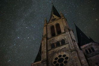 Die Stadtkirche von Tann im Sternenlicht mit dem Sternbild Cassiopeia. Foto: Dr. Andreas Hänel