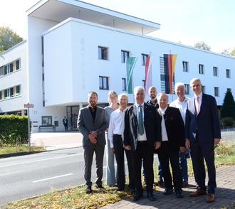 Von links: Die Architekten Thomas Kratz und Julia Roggel, Ehrenbürgermeister Hermann Brück, Bürgermeister Timo Zentgraf, Bauamtsleiter Steffen Schultheis, Pfarrer Rudolf Liebig, Bürgermeister a.D. Peter Meinecke sowie Bundestagsabgeordneter und Parlamentarischer Staatssekretär Michael Brand