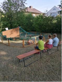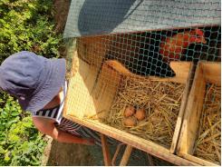 Die nächsten beiden Wochen hatten die Kinder alle Hände voll mit ihren gefiederten Gästen zu tun. Jeden Morgen wurden die gelegten Eier eingesammelt und die Hühner mit frischem Wasser und Körnern versorgt. Sollte das Hühnerhaus vielleicht auch einmal ausgemistet werden? Haben alle Hühner sich schon nach draußen gewagt oder muss da ein bisschen nachgeholfen werden? Was für eine Bedeutung haben die bunten Fußringe? Wie fühlt sich so ein Huhn eigentlich an?