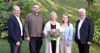 Gemeinsam mit der Leiterin des Kindergartens Sonnenhöhe, Gina Kretsch, dem stellv. Haupt- und Personalamtsleiter Markus Schäfer und dem Personalratsvorsitzenden Mathias Krüger wünschte Timo Zentgraf ihr alles Gute für den neuen Lebensabschnitt, vor allen Dingen aber Gesundheit und viel Zeit für ihre Familie.