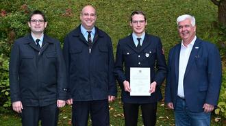 Von links: 1. stellv. Gemeindebrandinspektor Tobias Fraatz, Wehrführer Bastian Herber, 2. Stellv. Wehrführer Fabian Galasso und Bürgermeister Timo Zentgraf