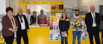 Von links: Vertriebsleiterin Anke Friese, Bürgermeister Timo Zentgraf, die Mitarbeiter der Postfiliale, Regionale Politikbeauftragte Gabriele Schulz, Geschäftsinhaber Elias Ahmad Shafiq und Vertriebsmanager Stefan Bott