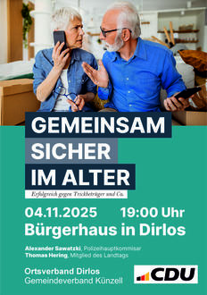 Der CDU-Ortsverband Dirlos/Keulos/Wissles und der CDU-Gemeindeverband Künzell laden Sie herzlich zu dem Vortrag „Gemeinsam sicher im Alter“ ein. In diesem Vortrag informiert Sie das Polizeipräsidium Osthessen über aktuelle Betrugsphänomene und Delikte zum Nachteil älterer Personen.