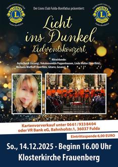 „So wächst ein Licht in dir geborgen“ wird der Auftakt sein am 14.12.2025 um 16:00 Uhr, in der wunderschönen Klosterkirche am Fuldaer Frauenberg. Denn dann lädt Sie der Lions Club Fulda Bonifatius wieder zu einer musikalischen Einstimmung auf das bevorstehende Weihnachtsfest ein.