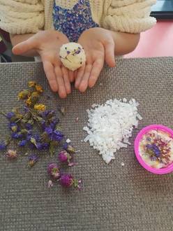 | Schritt 4: | Du füllst die Masse in ein Muffinsförmchen oder formst mit den Händen kleine Kugeln. Auf die Seifenmasse kannst du noch Kräuter oder Blüten streuen oder die Kugeln darin wälzen. |