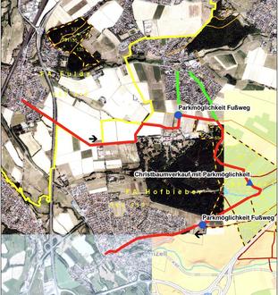 Um den Verkehr im Wald so gering wie möglich zu halten ist es möglich über die Parkplatzmöglichkeiten am Wartturmparkplatz Eichenzell einen ca. 1 km langen einfachen Fußweg oder ab Schloss Fasanerie über einen ca. 2 km langen einfachen Fußweg die Weihnachtsbaumfläche zu erreichen.