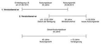 | • | Am Beispiel einer Doppel- bzw. Tiefgrabstätte errechnet sich die Dauer des Nutzungsrechts wie folgt: |