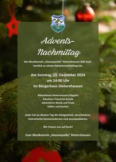 Der diesjährige Adventsnachmittag findet statt am 15. Dezember 2024 um 14 Uhr im Bürgerhaus Dietershausen.