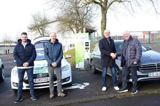 Von links: Daniel Müller (RhönEnergie), Martin Görnert (Künzeller Bauamt), Klaus Schäfer (e-Motion.world) und Bürgermeister Timo Zentgraf stellten gemeinsam die neuen Ladesäulen vor.