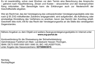 Wer ein Recht hat, das der Versteigerung des vorbezeichneten Versteigerungsobjekts oder des nach § 55 ZVG mithaftenden Zubehörs entgegensteht, wird aufgefordert, die Aufhebung oder einstweilige Einstellung des Verfahrens zu erwirken, bevor das Gericht den Zuschlag erteilt.