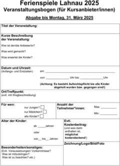 Diesen Bogen, der Ihnen übrigens auch auf der Internetseite der Gemeinde Lahnau unter „Leben in Lahnau/Jugendförderung/Ferienspiele 2025“ zur Verfügung steht, können Sie zum Ausfüllen verwenden.