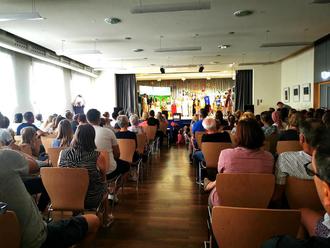 Und beide Vorführungen waren ein voller Erfolg! Die Gruppe durfte jeweils vor einem voll besetzten Bürgerhaus Atzbach, d. h., vor insgesamt mehr als 400 Personen spielen. Groß und Klein fühlte sich angesprochen und folgte der Einladung ins Bürgerhaus. Und das war gut und auch genauso erwünscht und erhofft. Bei der ersten Vorstellung mussten sogar noch weitere Stühle gestellt werden. Wie schön und praktisch, dass die kleinen Gäste einen „Ehrenplatz“ auf dem Boden genau vor der Bühne hatten…