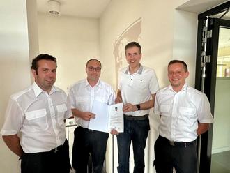 Das Bild zeigt v.r.n.l. Patrick Gerhardt (Stellv GBI), Bürgermeister Walendsius, Jens Oberding und Lahnaus Gemeindebrandinspektor Sebastian Schneider