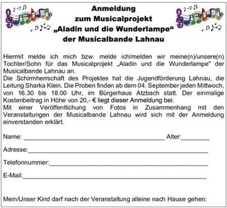 Nach den großen Erfolgen von „Grimm und weg. Falsches Spiel im Zauberwald!“ (2022/2023) sowie von „Peter Pan“ (2023/2024) steht -wie bereits angekündigt- das nächste Projekt der Musicalbande Lahnau -eine Generationen übergreifende Gruppe- unter Leitung von Sharka Klein in den Startlöchern: es ist dieses Mal „Aladdin und die Wunderlampe“ -ein phantasievolles Theaterstück für Kinder und Erwachsene von Patrick Ritschel (Text) und Uwe Heynitz (Musik). Neueinsteiger*innen -ob Groß oder Klein- sind herzlich willkommen!