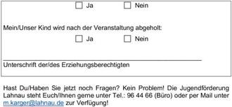 | Ansprechpartnerin: | Jugendförderung Lahnau, Tel.: 96 44 66 (Büro), Mail: m.karger@lahnau.de |