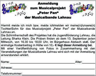 Nach dem grandiosen Erfolg von „Grimm und weg. Falsches Spiel im Zauberwald!“ steht das nächste Projekt der Musicalbande Lahnau unter Leitung von Sharka Klein in den Startlöchern: es ist dieses Mal das Familienmusical „Peter Pan“. Neueinsteiger*innen -ob Groß oder Klein- sind herzlich willkommen!
