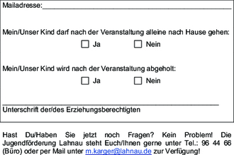 | Ansprechpartnerin: | Jugendförderung Lahnau, Tel.: 96 44 66 (Büro), Mail: m.karger@lahnau.de |