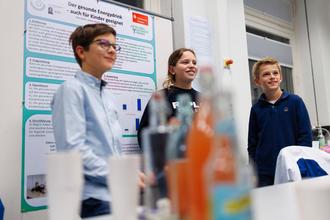 Ein halbes Jahr lang freiwillig naturwissenschaftlich forschen - dieser Herausforderung stellten sich die drei Schüler Tom Bardt, Jakob Heidel und Maximilian Orth aus dem sechsten Jahrgang. Sie nahmen am Projekt „Gießener Jugendliche forschen“, einer Kooperation der Hermann-Hofmann-Akademie und des Instituts für Biologiedidaktik der Justus-Liebig-Universität Gießen, teil. Gemeinsam gingen sie der Frage nach, ob sie einen gesunden Energydrink, der auch für Kinder geeignet ist, entwickeln können. Ihre Forscherergebnisse und ihr finales Produkt stellten sie am 19.11.2023 beim „Wissenschaftsfestival“ in der Hermann-Hofmann-Akademie gemeinsam mit 16 weiteren Forschergruppen aus Schulen in und um Gießen vor und stellten sich als jüngste Teilnehmer gekonnt den Fragen der „Wissenschaftsscouts“, die ihre Arbeit sehr lobten.