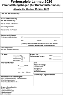 Diesen Bogen, der Ihnen übrigens auch auf der Internetseite der Gemeinde Lahnau unter „Leben in Lahnau/Jugendförderung/Ferienspiele 2026“ zur Verfügung steht, können Sie zum Ausfüllen verwenden.