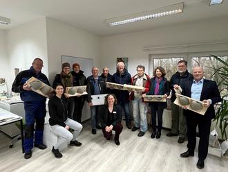 Naturschutzdezernent Christian Zuckermann (r.), Rosina Weber (2.v.l.) von der Unteren Naturschutzbehörde und Fachdienstleiterin Katharina Habenicht (vorne Mitte) haben die Nisthilfen an Vertreter:innen engagierter Naturschutzgruppen übergeben.