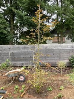 Diese junge Blutbuche wurde mit Mitteln aus dem Förderprogramm „Ein Baum vor meinem Haus“ bezuschusst. Demnächst wird sie nicht nur einen Beitrag zum Erhalt der Artenvielfalt leisten, sondern auch für den Klimaschutz. Denn ein einziger Baum entzieht der Atmosphäre pro Jahr 10 Kilogramm CO2.