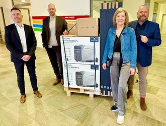 : Im Evangelischen Krankenhaus überreichen Geschäftsführer Markus Schäfer (l.) und Klinikmanager Norman Knortz (2. v. l.) die Ecoflow-Geräte der Agaplesion Stiftung im Wert von 20.000 Euro an Landrätin Anita Schneider und ihren Büroleiter Udo Liebich (r.)