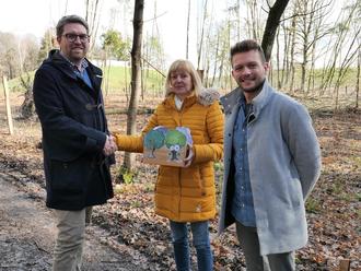Bei der Besichtigung der Pflanzfläche (im Hintergrund) und Übergabe der Spendenbox (v. l.): Marius Reusch, Annette Rühl und Michael Meier