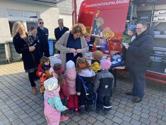 Was ist denn hier los? Schon die Kleinsten haben großes Interesse am Brandschutzerziehungsmobil und den vielen Materialien. Wie die Kitas das Thema in ihren Alltag integrieren, darüber haben sich Landrätin Anita Schneider (v.l.), FSJ-lerin Clara Schmitt, Brandschutzkoordinator Wolf-Christopher Gramatte und Kreisbrandinspektor Mario Binsch bei Kitaleiterin Jutta Pappler informiert. Mit dabei war auch der Grünberger Bürgermeister Marcel Schlosser.