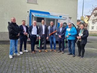 Bürgermeister Marius Reusch, die Breitbandkoordinatoren von Gemeinde und Landkreis, die Breitband Gießen GmbH und Projektleiter von Deutsche Glasfaser kamen am Freitag am Infomobil von Deutsche Glasfaser zusammen, um über den aktuellen Stand und den Endspurt zu informieren.