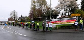 Der Organisator der Veranstaltung, Pfarrer i. R. Eberhard Klein, freute sich dennoch über die zahlreichen Menschen, die aus Lang-Göns, den umliegenden Ortsteilen und Nachbarkommunen gekommen waren, um am Straßenrand stehend ihre Ablehnung gegenüber jeglicher Form von Extremismus zu bekunden. Viele Leute präsentierten erneut das kleine Poster mit dem Logo der Mahnwache, das Eberhard Klein von den Ordnern hatte ausgeben lassen. Mit großen Bannern markierten Teilnehmer den Anfangs- und Endpunkt der Menschenkette. Darauf stand, unterlegt mit den Farben der Deutschlandflagge: „Mahnwache Langgöns – Demokratie schützen – gegen AfD und Rechtsextremismus“. Eine halbe Stunde demonstrierten die Teilnehmer allein durch ihre Anwesenheit.