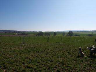 Blick in südöstliche Richtung über einen Teil der neu gepflanzten Walnussplantage