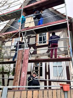 Die ehrenamtlichen Helfer beim Streichen der Fassade