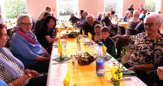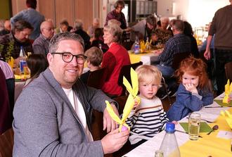 In der Karwoche wurde ein passendes Menü serviert: Für die Senioren gab es ganz traditionell Fischfilet mit Grüner Soße, Salat und Kartoffeln, für die kleinen Gäste standen Fischstäbchen, Gemüse und Kartoffelpüree auf dem Menüplan – natürlich durfte auch ein leckerer Nachtisch und kleine Ostersüßigkeiten nicht fehlen. Insgesamt hatten sich 85 Erwachsene angemeldet, darunter nicht nur Bürger aus Oberkleen. An den liebevoll österlich dekorierten Tischen saßen Kinder und Erwachsene bunt gemischt, vereinzelt sogar Enkel direkt neben ihren Groß- oder Urgroßeltern – auch zwei der drei Kinder des Bürgermeisters waren unter den kleinen Gästen.