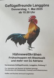 Die Geflügelfreunde Langgöns laden euch herzlich ein am 1. Mai 2024 ab 10:30 Uhr im Vereinsheim Rottweg 7 das Hähnewettkrähen zu erleben.