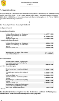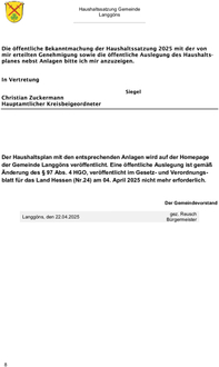 Der Haushaltsplan mit den entsprechenden Anlagen wird auf der Homepage der Gemeinde Langgöns veröffentlicht. Eine öffentliche Auslegung ist gemäß Änderung des § 97 Abs. 4 HGO, veröffentlicht im Gesetz- und Verordnungsblatt für das Land Hessen (Nr.24) am 04. April 2025 nicht mehr erforderlich.