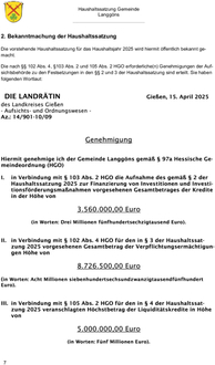 Hiermit genehmige ich der Gemeinde Langgöns gemäß § 97a Hessische Gemeindeordnung (HGO)