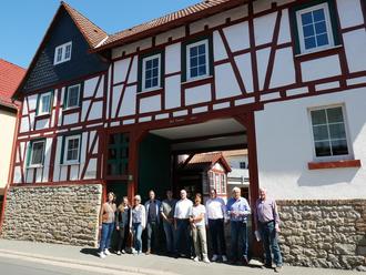 So sieht das Wirtschaftsgebäude nach der gelungenen Sanierung aus: Ein echtes Hingucker-Schmuckstück, worüber sich Doris Müller-Heinz, Gerhard Heinz (5. u. 6. v. r.) und ihre Gäste beim Ortstermin freuen
