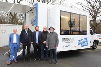 Hans Noormann, Erster Beigeordneter der Gemeinde Langgöns (2.v.l.), und das Smart-Region-Team freuen sich auf die regelmäßigen Besuche des Zukunftsbusses Digital.Mobil in Langgöns