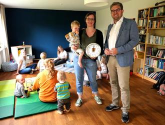 Die Bedeutung dieses niedrigschwelligen Projekts für junge Familien unterstreicht auch der Langgönser Bürgermeister Marius Reusch, selbst Vater von drei Kindern im Grundschul- und Kita-Alter: „Es ist ein wichtiges soziales Angebot vor der Kita und absolut unterstützenswert“, betont er. Als Almut Völkner vor einiger Zeit auf ihn zukam und um Beistand bat, war er sofort dazu bereit: „Gerne hat die Gemeinde eine kleine Anschubzuwendung für die Erstausstattung bei den Sachkosten geleistet.“ Damit solle auch die Wertschätzung für diese Einrichtung zum Ausdruck gebracht werden. Bei seinem Antrittsbesuch in den neuen Räumlichkeiten überreichte der Rathauschef der Botschafterin eine Langgöns-Uhr und zeigte sich angetan: „Es ist sehr schön und gemütlich geworden.“ Er nutzte auch die Gelegenheit, sich mit den jungen Müttern bei Kaffee und Keksen auszutauschen.