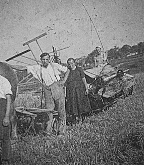 Erntebild mit einem Selbstbinder in Kirch-Göns von 1944. Von links der Pole Stanislaus Machala, daneben Tilla Hanack, geb. Wagner und Irene Müller, geb. Wagner
