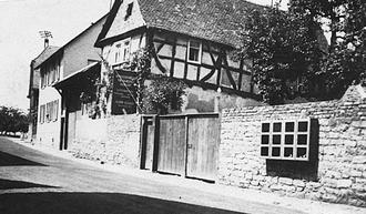Rechtenbacher Straße 29, um 1948: Von der Scheune aus floh der Mann im Juli 1944. Beim Versuch, über die Mauer zu klettern, wurde er erschossen. Das Gebäude wurde 1985 abgerissen