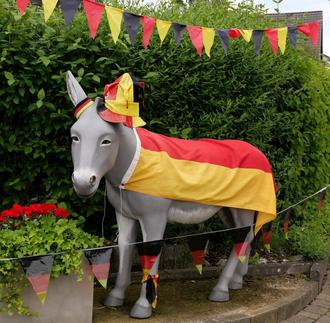 Die „Wappentiere“ des Dörfchens, dessen Bewohner sich seit jeher mit Stolz als „Esel“ bezeichnen, tragen Banner, Schals, Bänder und Hüte in den Nationalfarben. Man könnte fast meinen, sie seien bereit, selbst auf den Platz zu trotten und ein paar Tore zu schießen. Ein neuer Trick des innovativ denkenden Bundestrainers? Esel im Sturm? Oder besser in der Defensive? Soweit sind wir noch nicht, aber Dornholzhausen zeigt definitiv Teamgeist.