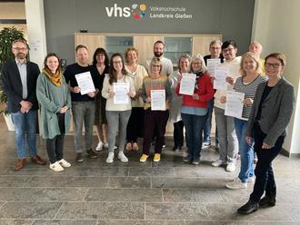 Glückwünsche an die erfolgreichen Teilnehmenden des ersten Bildungsurlaubs „Lebensbegleitung für Senioren - Sorgearbeit im Spannungsfeld zwischen gesellschaftlicher Relevanz und Anerkennung“ gab es von Christa Hofmann-Bremer (l.), Leiterin der Altenhilfe-Einrichtungen der Diakonie sowie von Torsten Denker, Leiter der Kreisvolkshochschule (l.) und Alexandra Böckel vom Freiwilligenzentrum Mittelhessen (2. v. l.)