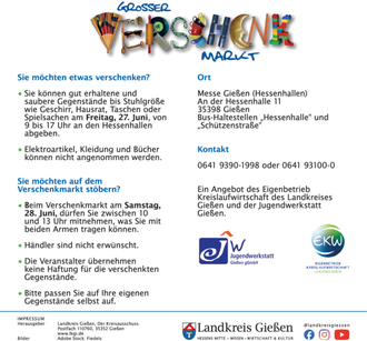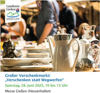 Landkreis Gießen. Verschenken statt Wegwerfen: Das ist das Motto des Verschenkmarkts, der in diesem Jahr am Samstag, den 28. Juni, in den Hessenhallen der Messe Gießen stattfindet. Zwischen 10 und 13 Uhr können Interessierte auf einem Basar mit nützlichen und schönen Haushaltswaren stöbern und diese kostenlos mitnehmen. Organisiert wird der Verschenkmarkt vom Eigenbetrieb Kreislaufwirtschaft des Landkreises Gießen in Kooperation mit der Jugendwerkstatt Gießen gGmbH. Die Partner verfolgen damit ein bewährtes Konzept, denn die Aktion findet in diesem Jahr schon zum 25. Mal statt.